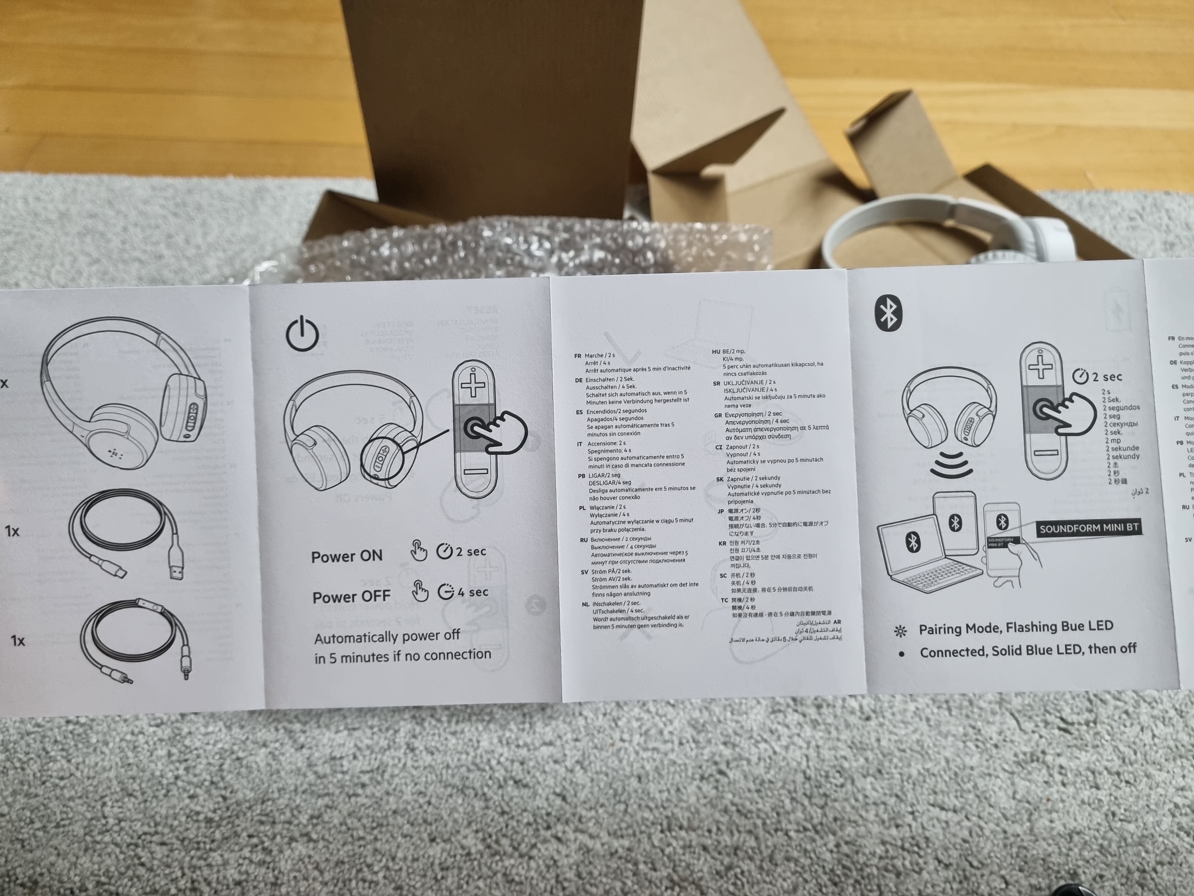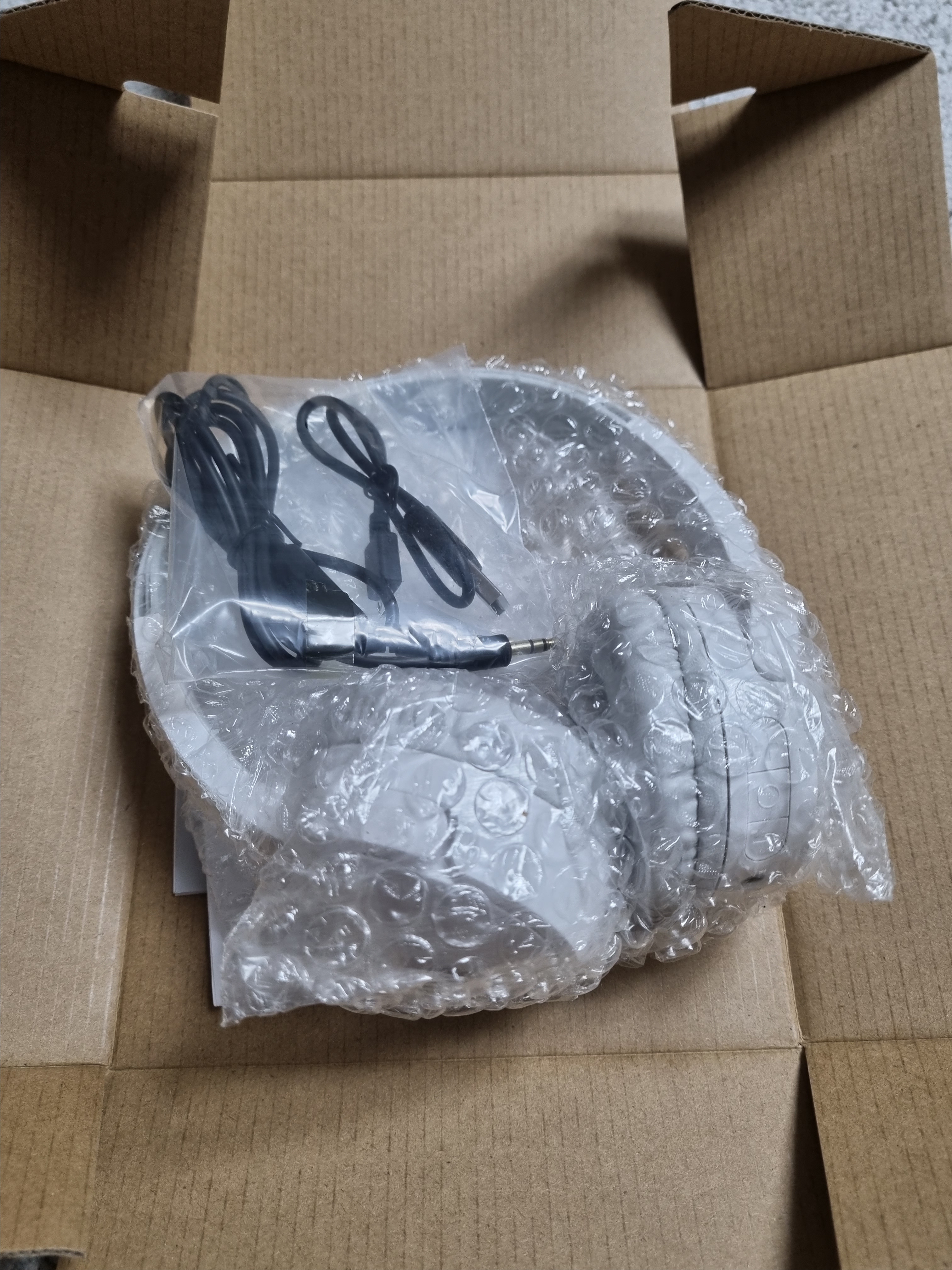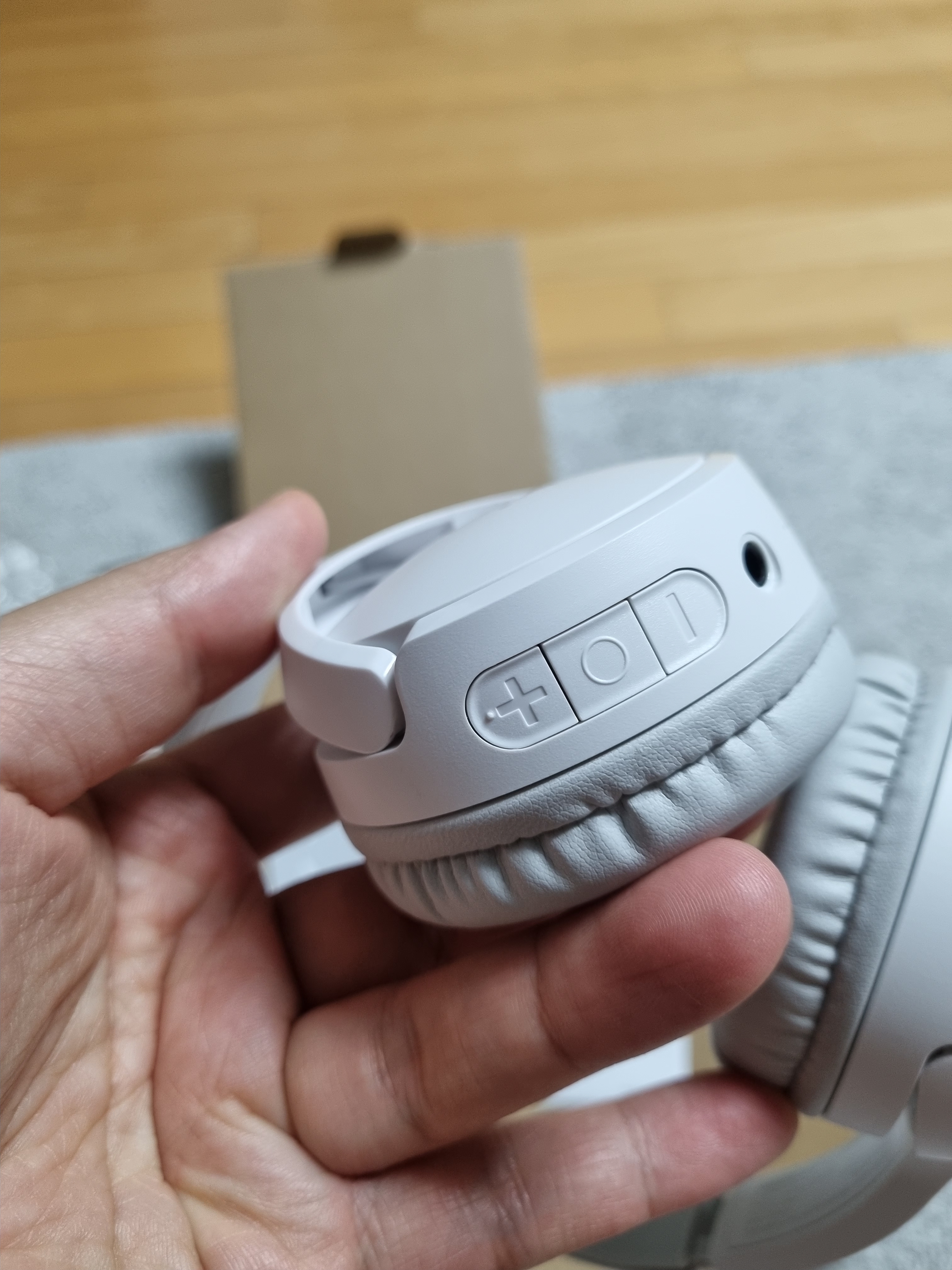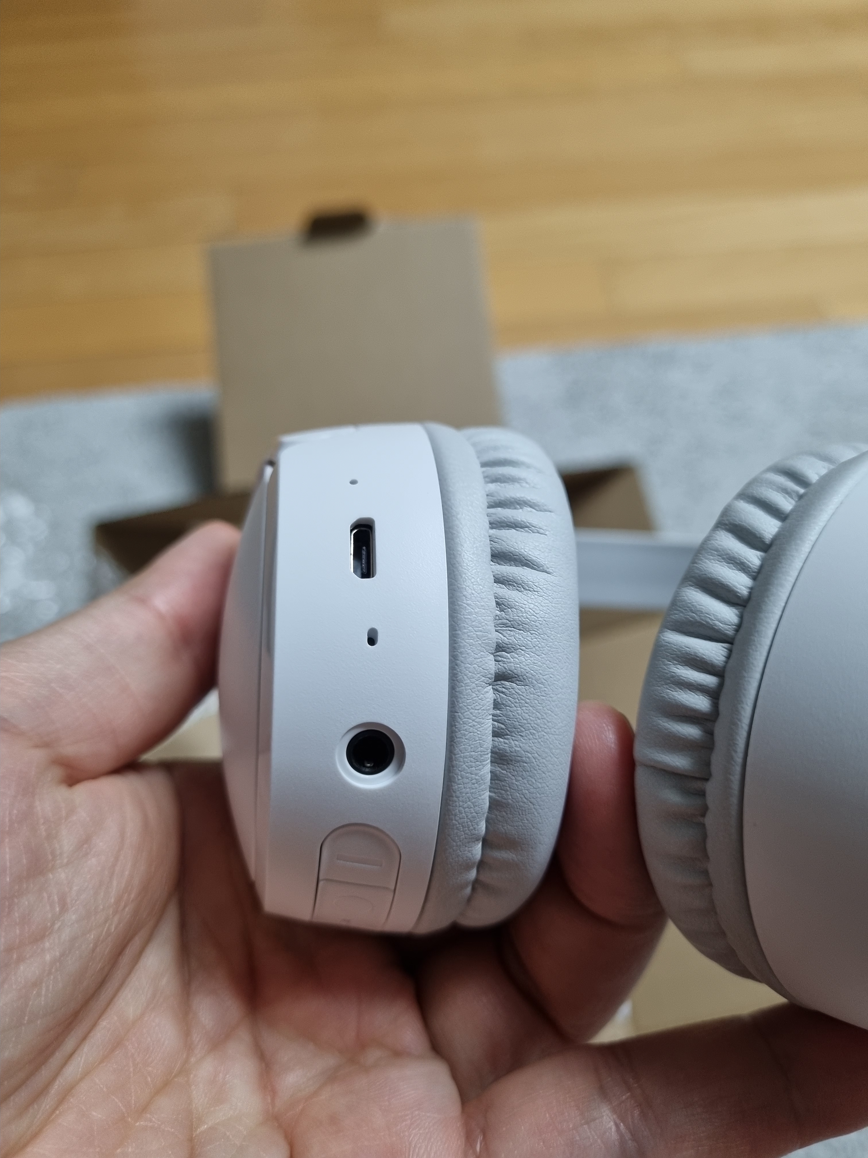 구성품은 헤드폰 본체, 유선 3.5파이 케이블, 충전 케이블 (micro 5pin)
