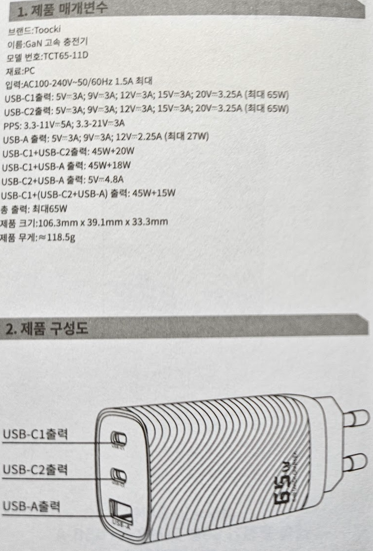toocki 65W Gan 3포트 PPS PD 초고속 충전기 이다.