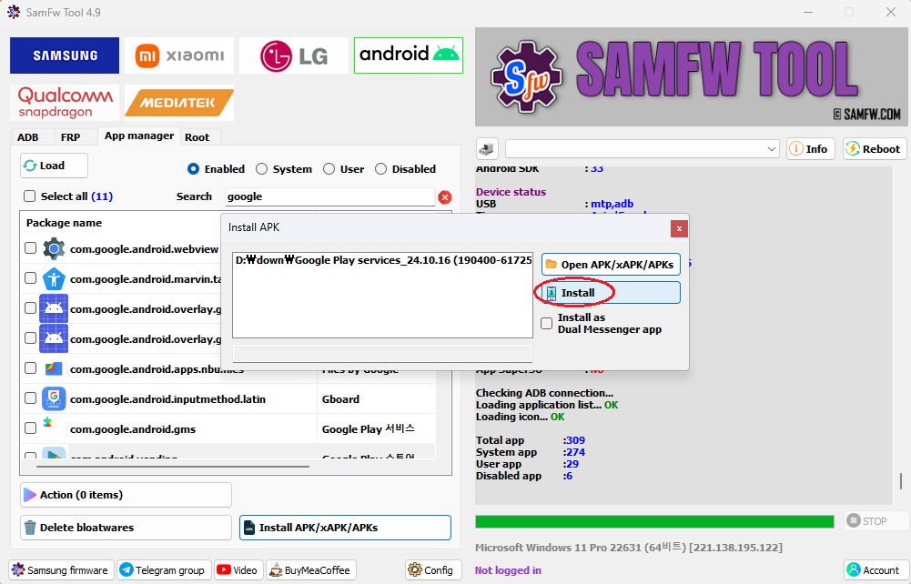 8. 세가지 apk 파일을 모두 다운받았다면 SamFw로 설치해줍니다.