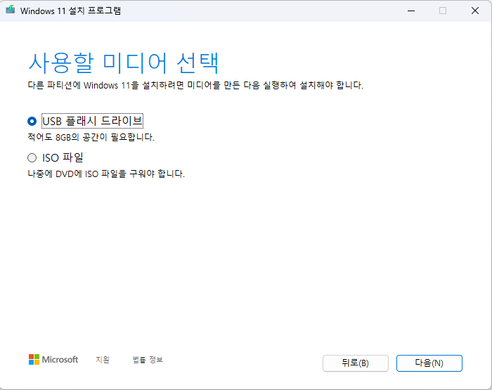 윈도우 11 설치 프로그램을 다운받아 실행하면 설치 USB를 만들 수 있습니다.