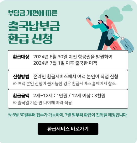 2024년 7월 1일 시행 개편에 따른 출국납부금 인하 및 과납부 환급 제도는, 특히 6월 30일 이전 예매자와 12세 미만 아동 동반 여행객에게 직접적인 혜택이 됩니다. 환급을 놓치지 않도록 온라인 시스템 오픈 후 신속히 신청!!